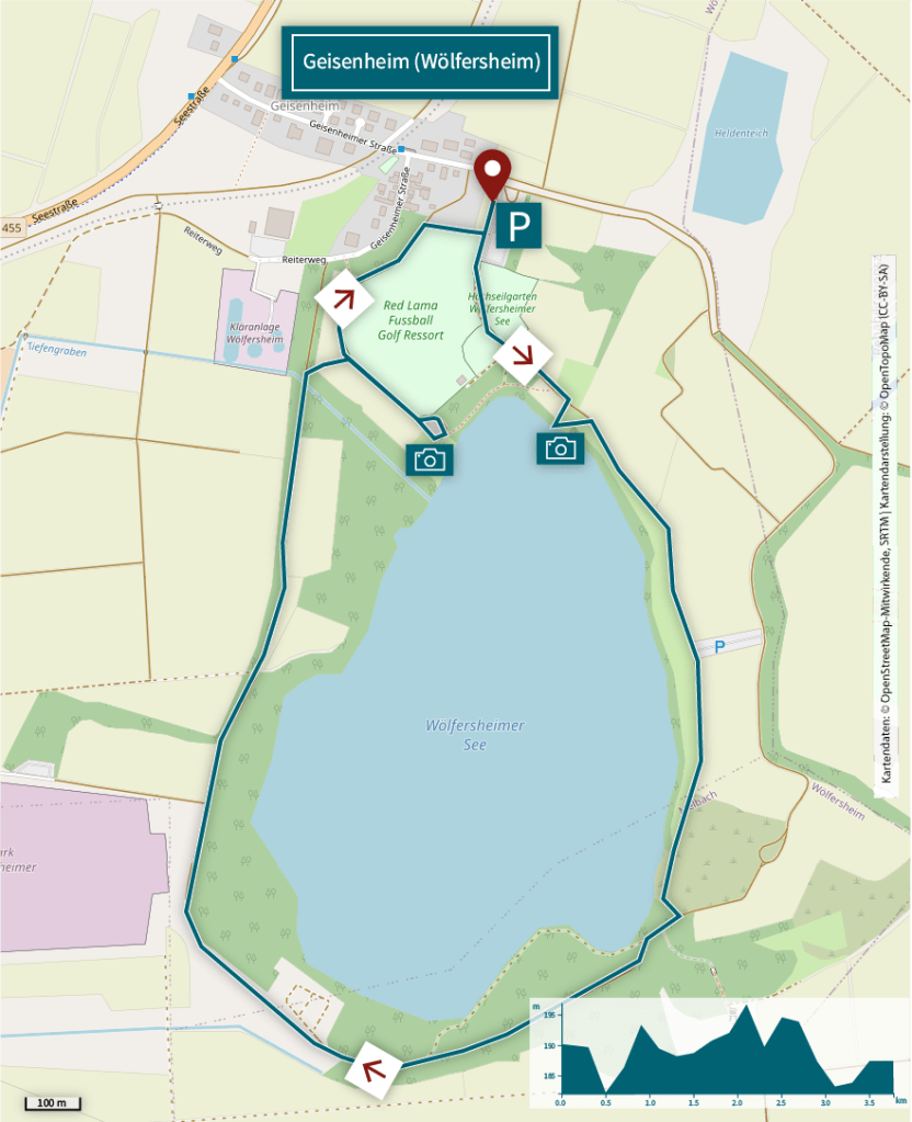 Es gibt einen großen Parkplatz am Seegelände im Bereich des Wölfersheimer Stadtteiles Geisenheim. Die Parkfläche besteht zum Teil aus wassergebundenem Feingranulat mit Grobschotter. Rollstuhlfahrerparkplätze sind nicht ausgeschildert.