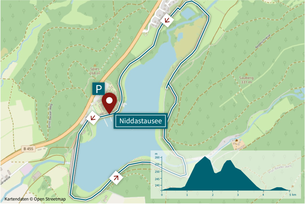 Der Weg umrundet den zwischen 1968 und 1970 gebauten Nidda- Stausee. Der Stausee ist mit einer Dammhöhe von 35 m einer der größten Stauseen Hessens. Bademöglichkeiten, Liegewiese, Tretbootverleih sind vorhanden. Auf dem Rundweg gibt es herrliche Ausblicke auf die Wasserfläche und die Landschaft des Vogelsbergs.