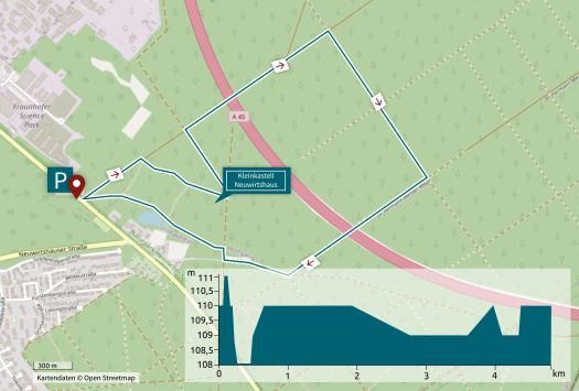 ∙ Im Bereich des Römerkastells „Neuwirtshaus“ schmaler, ca. 500m langer Naturweg mit Baumwurzeln bis 10 cm und Bereiche mit Seitneigung < 5%