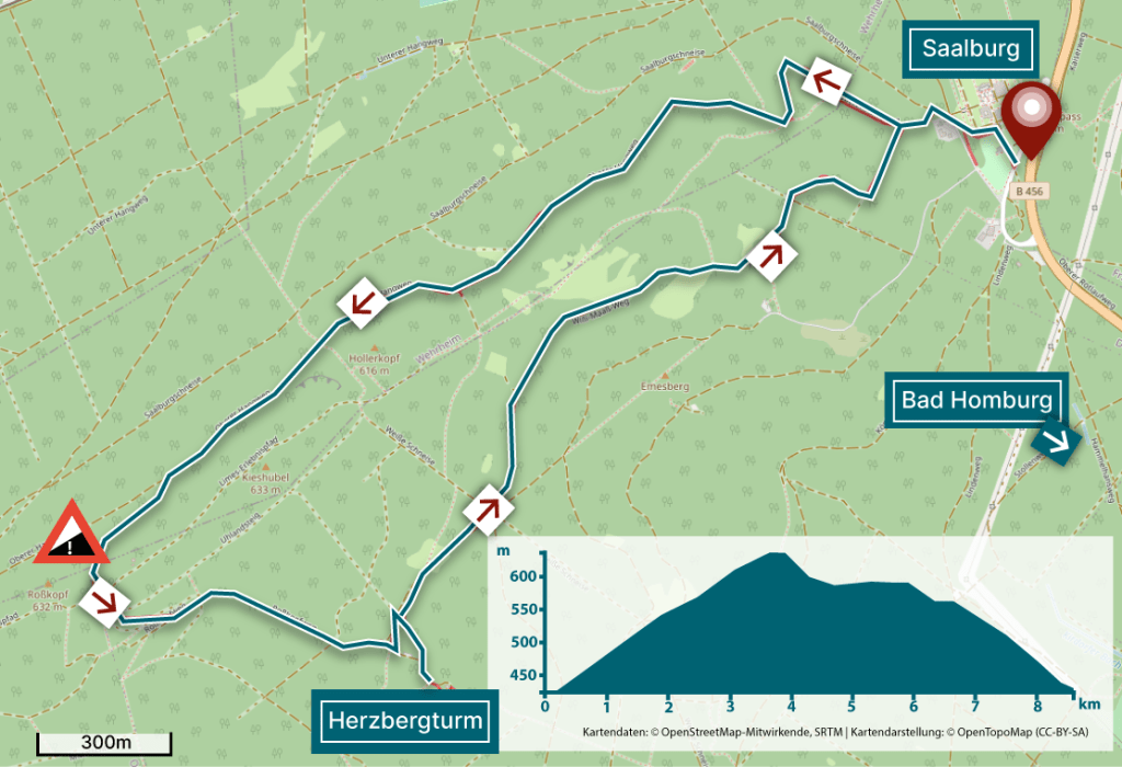Die Saalburg kann von März bis Oktober besichtigt werden. Weitere Informationen zum Thema Barrierefreiheit der Saalburg finden Sie auf der Website von TaunusTouristik Service e.V. Im weiteren Verlauf bietet der Rundweg eine hervorragende Fernsicht in den Hintertaunus und in das östliche Rhein-Main-Gebiet. Der Herzbergturm, leider nicht barrierefrei zugänglich, ist ein weiteres Highlight des Rundwegs und auch einen Abstecher wert.